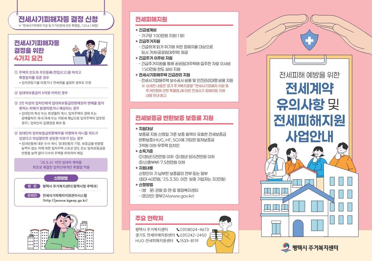 한편 전세 사기 피해로 어려움을 겪는 피해자들을 위해 평택시 주거복지센터에서 전세 사기 피해 접수, 긴급 생계비 지원, 긴급 주거지원, 긴급 주거지원 이주비 등 다양한 서비스를 제공하고 있다.